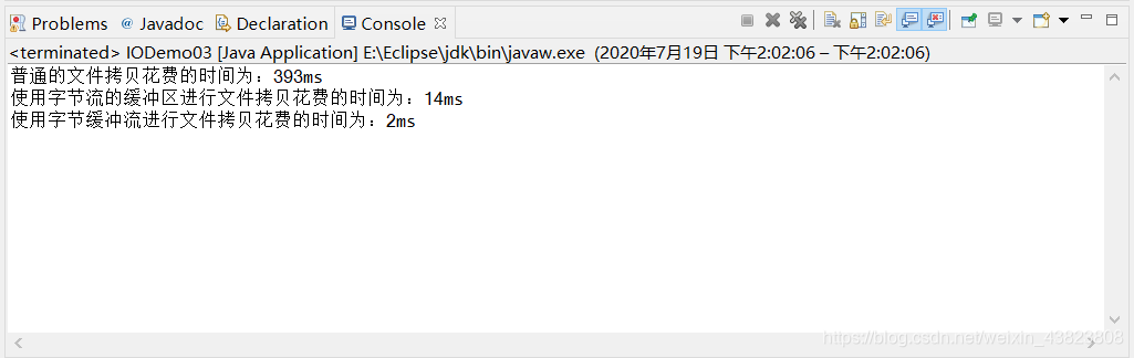 从图中可以看出拷贝文件所消耗的时间明显减少了很多,这说明使用字节缓冲流同样可以有效的提高程序的传输效率。