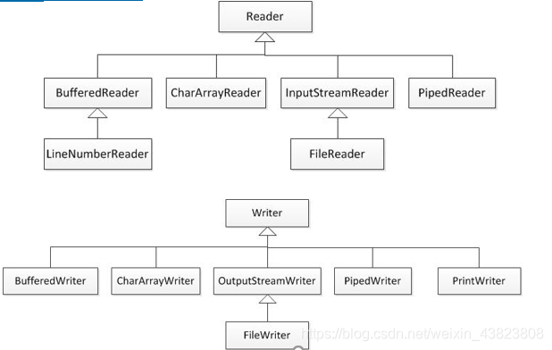说明:除了字节流,JDK还提供了用于实现字符操作的字符流,同字节流一样,字符流也有两个抽象的顶级父类,分别是Reader 和 Writer。它们之间的继承体系如下:👇👇👇