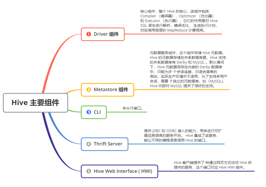 Hive 主要组件包括 UI 组件、 Driver 组件( Complier Optimizer Executor )、 Metastore组件、 CLI ( Command Line Interface ,命令行接口)、 JDBC/ODBC 、Thrift Server 和 Hive Web Interface (HWI )等。
