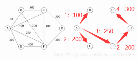 我们纵观图中的所有边,首先选出最小的一条边,也就是A→B:100,此时最小生成树中有A、B两个结点;之后再从图中找出值最小的边,可以看到有两条A→E:200、F→D:200,加进来这两条边之后,并没有产生环路的现象,所以可以加入,此时最小生成树中有A、B、E、F、D这些结点;接下来,继续寻找值最小的边,应该时A→F:250,将其加入;最后因为不能产生环路,所以只能添加值最小的边D→C:300。至此,已遍历全图的顶点。(图中的1、2、3、4表示加入这条边的顺序,冒号后面的是对应边的具体值)