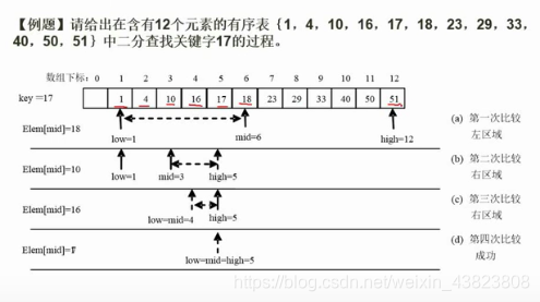 ④此时二分查找的区间只剩一个元素,即第五个元素17,比较得17=17,所以查找成功。(一共进行了4次比较)