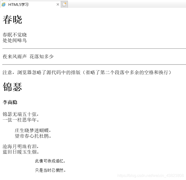 <!DOCTYPE html> <html lang="zh"> <head> <meta charset="gb2312"> <title>HTML5学习</title> </head> <body> <h1>春晓</h1> <p>春眠不觉晓<br/>处处闻啼鸟</p> <hr/> <p> 夜来风雨声 花落知多少 </p> <hr/> <p>注意,浏览器忽略了源代码中的排版(省略了第二个段落中多余的空格和换行)</p> <h1>锦瑟</h1> <h4>李商隐</h4> 锦瑟无端五十弦,<br/> 一弦一柱思华年。<br/> <blockquote> 庄生晓梦迷蝴蝶,<br/> 望帝春心托杜鹃。<br/> </blockquote> 沧海月明珠有泪,<br/> 蓝田日暖玉生烟。<br/> <pre> 此情可待成追忆,<br/> 只是当时已惘然。<br/> </pre> </body> </html>