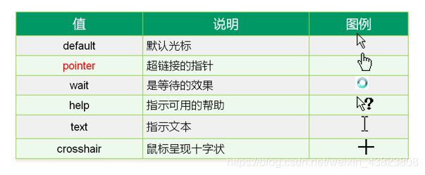 这里的鼠标形状是通过标签 cursor 来设置的,常见的一些鼠标形状如上图所示。下面我们来看一个实例:👇👇👇