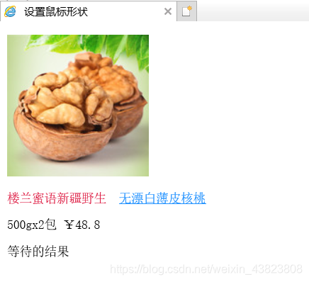<!DOCTYPE html> <html lang="zh"> <head> <meta charset="gb2312"/> <title>设置鼠标形状</title> <style type="text/css"> img { border: 0px; } p { font-size: 14px; } a { color: crimson; text-decoration: none; } a:hover { color: dodgerblue; text-decoration: underline; cursor: help; } span { cursor: pointer; } </style> </head> <body> <p><a href="#"><img src="E:\计算机专业学习资料和文件\HTML\image\hetao.jpg" alt="无漂白薄皮核桃" /></a></p> <p><a href="#">楼兰蜜语新疆野生</a> <a href="#">无漂白薄皮核桃</a></p> <p><span>500gx2包 ¥48.8</span></p> <p style="cursor: wait;">等待的结果</p> </body> </html>