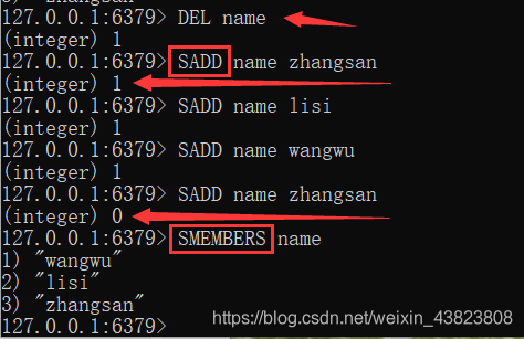 设置键值对:SADD 添加一个String元素到key对应的Set集合中,添加成功则返回1,如果元素已经在集合中则返回0。 获取键值对:SMEMBERS