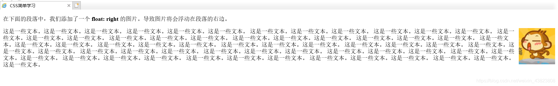 <!DOCTYPE html> <html lang="en"> <head> <meta charset="utf-8" /> <title>CSS简单学习</title> <style type="text/css"> img { float: right; } </style> </head> <body> <p>在下面的段落中,我们添加了一个 <b>float: right</b> 的图片。导致图片将会浮动在段落的右边。</p> <p> <img src="img/images/tx.jpg" width="100" height="100" /> 这是一些文本。这是一些文本。这是一些文本。 这是一些文本。这是一些文本。这是一些文本。 这是一些文本。这是一些文本。这是一些文本。 这是一些文本。这是一些文本。这是一些文本。 这是一些文本。这是一些文本。这是一些文本。 这是一些文本。这是一些文本。这是一些文本。 这是一些文本。这是一些文本。这是一些文本。 这是一些文本。这是一些文本。这是一些文本。 这是一些文本。这是一些文本。这是一些文本。 这是一些文本。这是一些文本。这是一些文本。 这是一些文本。这是一些文本。这是一些文本。 这是一些文本。这是一些文本。这是一些文本。 这是一些文本。这是一些文本。这是一些文本。 这是一些文本。这是一些文本。这是一些文本。 这是一些文本。这是一些文本。这是一些文本。 这是一些文本。这是一些文本。这是一些文本。 这是一些文本。这是一些文本。这是一些文本。 这是一些文本。这是一些文本。这是一些文本。 这是一些文本。这是一些文本。这是一些文本。 这是一些文本。这是一些文本。这是一些文本。 这是一些文本。这是一些文本。这是一些文本。 </p> </body> </html>