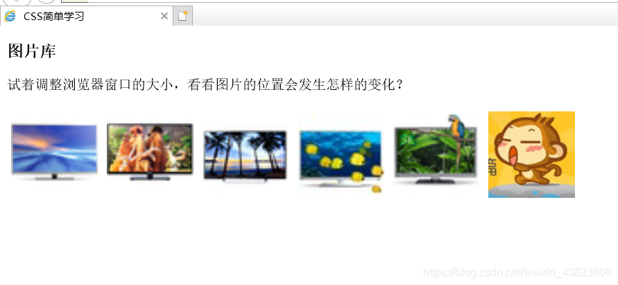 <!DOCTYPE html> <html lang="en"> <head> <meta charset="utf-8"> <title>CSS简单学习</title> <style type="text/css"> .ex { float: left; width: 100px; height: 100px; margin: 5px; } </style> </head> <body> <h3>图片库</h3> <p>试着调整浏览器窗口的大小,看看图片的位置会发生怎样的变化?</p> <img class="ex" src="img/images/tv01.jpg" width="100" height="100" /> <img class="ex" src="img/images/tv02.jpg" width="100" height="100" /> <img class="ex" src="img/images/tv03.jpg" width="100" height="100" /> <img class="ex" src="img/images/tv04.jpg" width="100" height="100" /> <img class="ex" src="img/images/tv05.jpg" width="100" height="100" /> <img class="ex" src="img/images/tx.jpg" width="100" height="100" /> </body> </html>