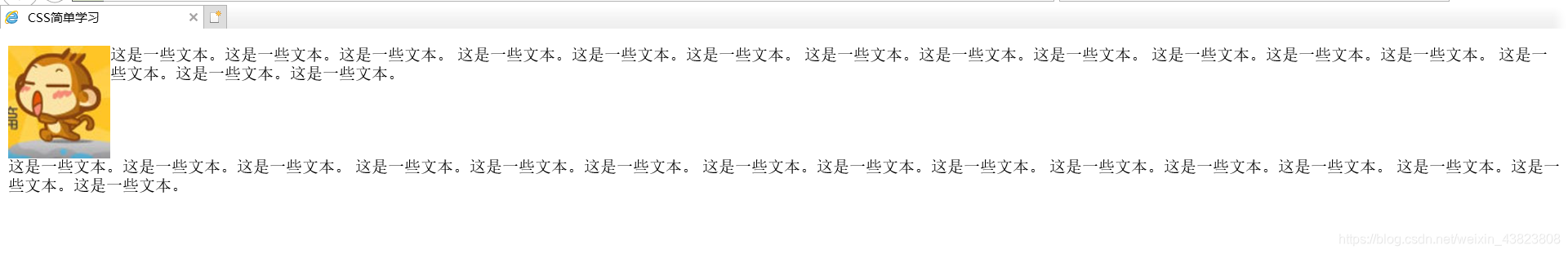 <!DOCTYPE html> <html lang="en"> <head> <meta charset="utf-8"> <title>CSS简单学习</title> <style type="text/css"> img { float: left; } p.clear { clear: both; } </style> </head> <body> <img src="img/images/tx.jpg" width="100" height="110" /> <p> 这是一些文本。这是一些文本。这是一些文本。 这是一些文本。这是一些文本。这是一些文本。 这是一些文本。这是一些文本。这是一些文本。 这是一些文本。这是一些文本。这是一些文本。 这是一些文本。这是一些文本。这是一些文本。 </p> <p class="clear"> 这是一些文本。这是一些文本。这是一些文本。 这是一些文本。这是一些文本。这是一些文本。 这是一些文本。这是一些文本。这是一些文本。 这是一些文本。这是一些文本。这是一些文本。 这是一些文本。这是一些文本。这是一些文本。 </p> </body> </html>