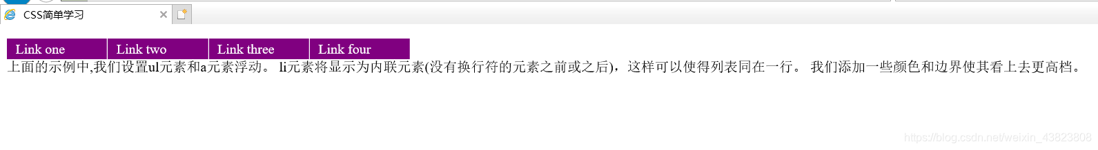 <!DOCTYPE html> <html lang="en"> <head> <meta charset="utf-8"> <title>CSS简单学习</title> <style type="text/css"> ul { float: left; width: 100%; padding: 0; margin: 0; list-style-type: none; } a { float: left; width: 6rem; padding: 3px 10px; background-color: purple; color: white; border-right: 1px solid white; text-decoration: none; } a:hover { background-color: red; } li { display: inline; } </style> </head> <body> <ul> <li><a href="#">Link one</a></li> <li><a href="#">Link two</a></li> <li><a href="#">Link three</a></li> <li><a href="#">Link four</a></li> </ul> <p> 上面的示例中,我们设置ul元素和a元素浮动。 li元素将显示为内联元素(没有换行符的元素之前或之后),这样可以使得列表同在一行。 我们添加一些颜色和边界使其看上去更高档。 </p> </body> </html>