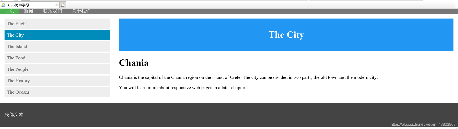 <!DOCTYPE html> <html lang="en"> <head> <meta charset="utf-8"> <title>CSS简单学习</title> <link href="css/style.css" rel="stylesheet" type="text/css" /> </head> <body> <ul class="topmenu"> <li><a href="#home" class="active">主页</a></li> <li><a href="#news">新闻</a></li> <li><a href="#contact">联系我们</a></li> <li><a href="#about">关于我们</a></li> </ul> <div class="clearfix"> <div class="column sidemenu"> <ul> <li><a href="#flight">The Flight</a></li> <li><a href="#city" class="active">The City</a></li> <li><a href="#island">The Island</a></li> <li><a href="#food">The Food</a></li> <li><a href="#people">The People</a></li> <li><a href="#history">The History</a></li> <li><a href="#oceans">The Oceans</a></li> </ul> </div> <div class="column content"> <div class="header"> <h1>The City</h1> </div> <h1>Chania</h1> <p>Chania is the capital of the Chania region on the island of Crete. The city can be divided in two parts, the old town and the modern city.</p> <p>You will learn more about responsive web pages in a later chapter.</p> </div> </div> <div class="footer"> <p>底部文本</p> </div> </body> </html>