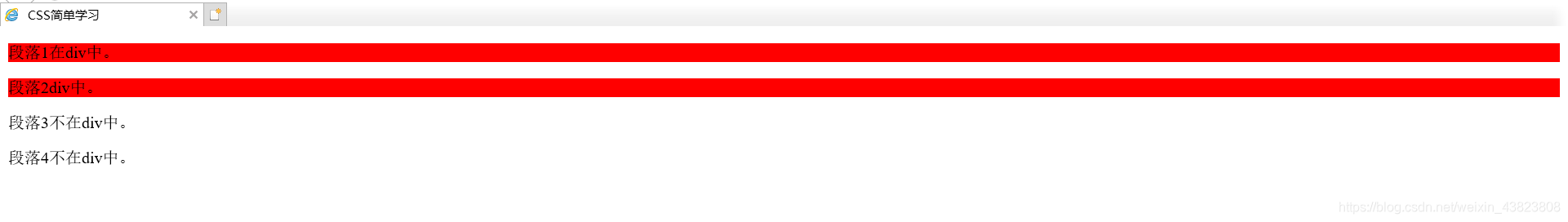 <!DOCTYPE html> <html lang="en"> <head> <meta charset="utf-8" /> <title>CSS简单学习</title> <style type="text/css"> div p { background-color: red; } </style> </head> <body> <div> <p>段落1在div中。</p> <p>段落2div中。</p> </div> <p>段落3不在div中。</p> <p>段落4不在div中。</p> </body> </html>