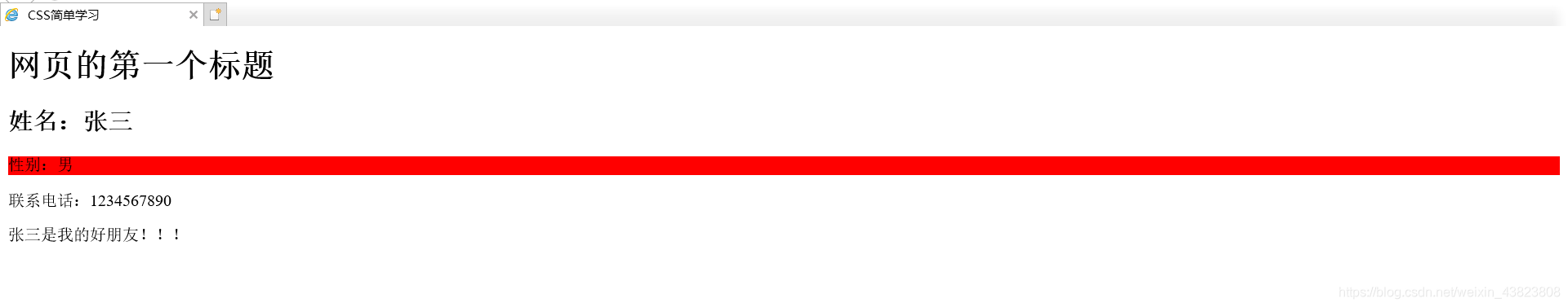 <!DOCTYPE html> <html lang="en"> <head> <meta charset="utf-8"> <title>CSS简单学习</title> <style type="text/css"> div>p { background-color: #FF0000; } </style> </head> <body> <h1>网页的第一个标题</h1> <div> <h2>姓名:张三</h2> <p>性别:男</p> </div> <div> <span><p>联系电话:1234567890</p></span> </div> <p>张三是我的好朋友!!!</p> </body> </html>