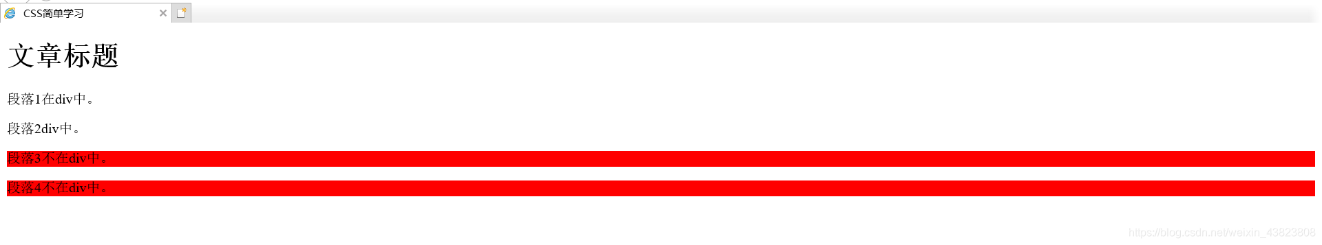 <!DOCTYPE html> <html lang="en"> <head> <meta charset="utf-8"> <title>CSS简单学习</title> <style type="text/css"> div~p { background-color: #FF0000; } </style> </head> <body> <h1>文章标题</h1> <div> <p>段落1在div中。</p> <p>段落2div中。</p> </div> <p>段落3不在div中。</p> <p>段落4不在div中。</p> </body> </html>