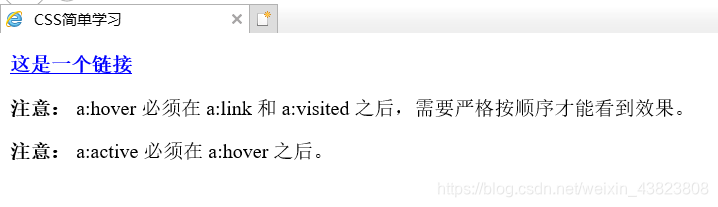 <!DOCTYPE html> <html lang="en"> <head> <meta charset="utf-8" /> <title>CSS简单学习</title> <style type="text/css"> a:link {color: blue;} a:visited {color: purple;} a:hover {color: red;} a:active {color: green;} </style> </head> <body> <p><b><a href="https://www.runoob.com" target="_blank">这是一个链接</a></b></p> <p><b>注意:</b> a:hover 必须在 a:link 和 a:visited 之后,需要严格按顺序才能看到效果。</p> <p><b>注意:</b> a:active 必须在 a:hover 之后。 </body> </html>