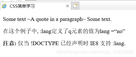 <!DOCTYPE html> <html lang="en"> <head> <meta charset="utf-8"> <title>CSS简单学习</title> <style type="text/css"> q:lang(no) { quotes: "~" "~"; } </style> </head> <body> <p>Some text <q lang="no">A quote in a paragraph</q> Some text.</p> <p>在这个例子中, :lang定义了q元素的值为lang =“no”</p> <p><b>注意:</b> 仅当 !DOCTYPE 已经声明时 IE8 支持 :lang.</p> </body> </html>