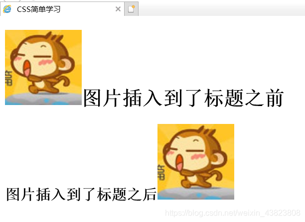 <!DOCTYPE html> <html lang="en"> <head> <meta charset="utf-8"> <title>CSS简单学习</title> <style type="text/css"> h1::before { content: url(img/images/tx.jpg); } h2::after { content: url(img/images/tx.jpg); } </style> </head> <body> <h1>图片插入到了标题之前</h1> <h2>图片插入到了标题之后</h2> </body> </html>