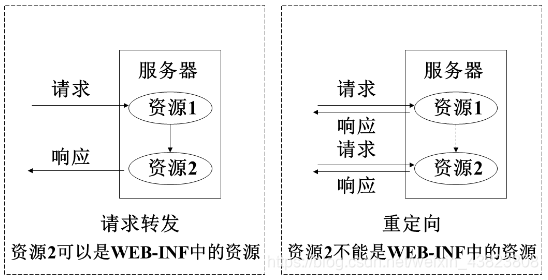 注意,对于请求转发的页面,可以是 WEB-INF 中页面;而重定向的页面,是不能为 WEB-INF 中页的。因为重定向相当于用户再次发出一次请求,而用户是不能直接访问 WEB-INF 中资源的。
