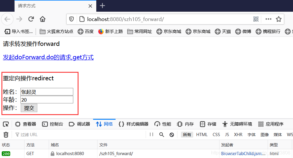 <%@ page contentType="text/html;charset=utf-8" language="java" %> <html> <head> <title>请求方式</title> </head> <body> <p>请求转发操作forward</p> <a href="test/doForward.do">发起doForward.do的请求,get方式</a> <br/><br/> <p>重定向操作redirect</p> <form action="test/doRedirect.do" method="post"> 姓名:<input type="text" name="name"><br/> 年龄:<input type="text" name="age"><br/> 操作:<input type="submit" value="提交"> </form> </body> </html>