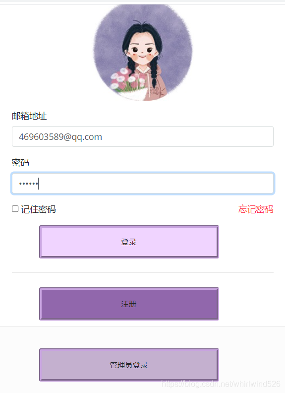 - 验证信息:输入邮箱与密码,如果正确则进入网站首页,如果错误则提示错误信息