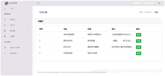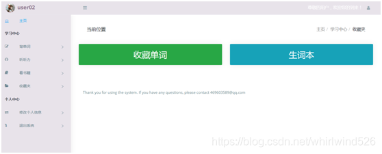 本系统的用户角色分为前端用户和后端管理用户角色,前端用户可以在本系统中进行注册后登陆,注册后会向用户的邮箱发送一个激活账户的邮箱,用户登陆邮箱后在线激活账户方可登陆系统。登陆系统后可以在线学习英语单词 ,进行听力训练,进行在线阅读学习等操作。后台管理账户登陆系统后可以对学习单词 、书籍、用户等 信息进行相应的管理操作。