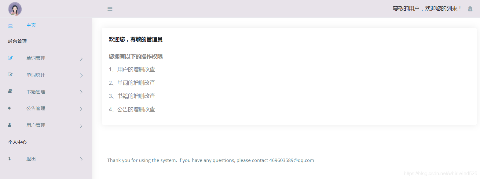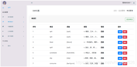 - 管理员可以进入后台,对系统的用户,单词,书籍,公告进行管理