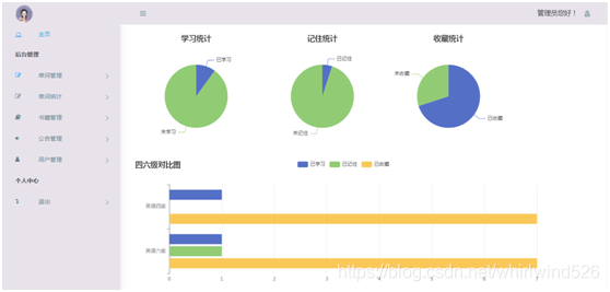 管理员登陆系统后可以实现单词管理、单词记忆统计、书籍管理、公告管理、用户管理等功能。