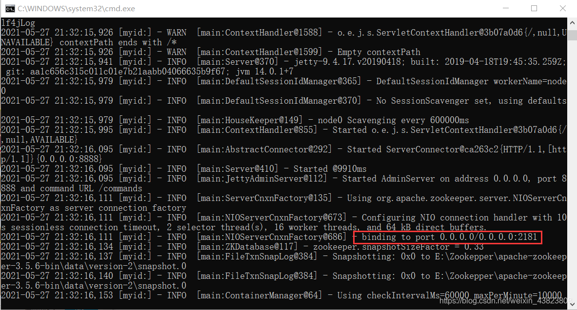 改完之后,进入bin目录下,找到 zkServer.cmd,启动Zookeeper。看到红色框中的内容,说明你的Zookeeper已经启动成功了。