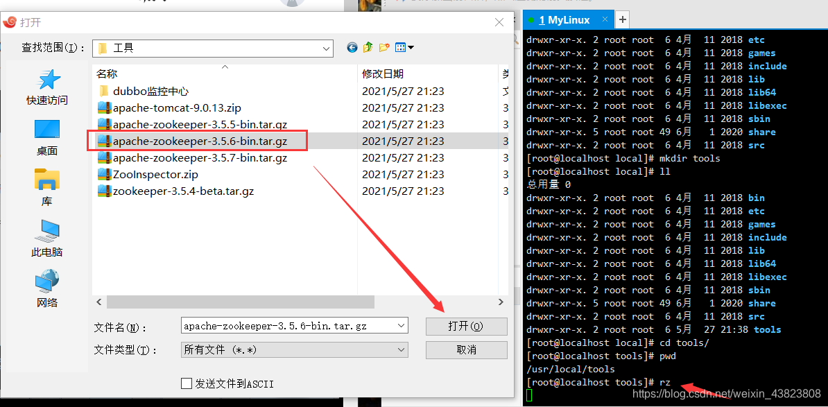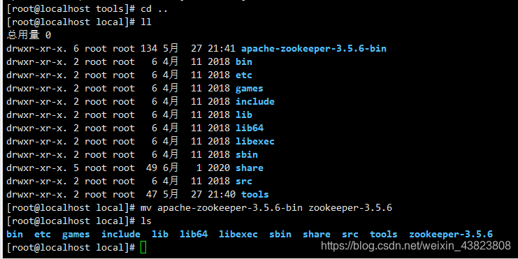 这里我进入到了 /usr/local 目录下,创建了一个 tools 目录,将zookeeper的压缩包上传到这个目录中,然后解压。