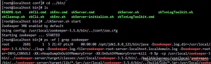 保存退出之后,回到zookeeper根目录下的bin目录中,./zkServer.sh start 启动zookeeper即可。