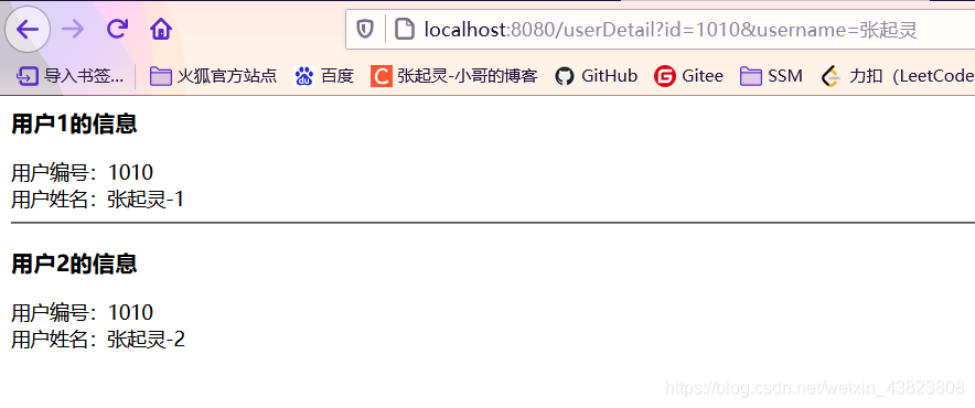 <%@ page contentType="text/html;charset=utf-8" language="java" %> <html> <head> <title>$</title> </head> <body> <h3>用户1的信息</h3> <div>用户编号:${user1.id}</div> <div>用户姓名:${user1.username}</div> <hr/> <h3>用户2的信息</h3> <div>用户编号:${user2.id}</div> <div>用户姓名:${user2.username}</div> </body> </html>