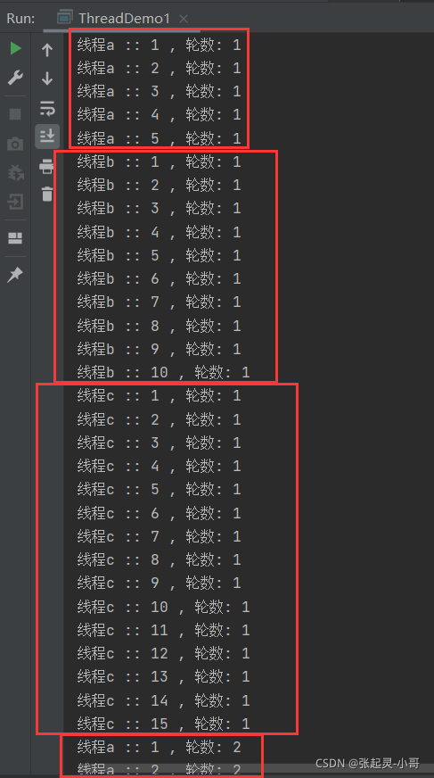 这个案例实现的是:三个线程(a、b、c)循环交替打印,也就是线程a打印5行、线程b接着打印10行、线程c继续打印15行、线程a再打印5行......,这样一直循环下去。