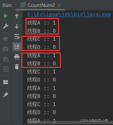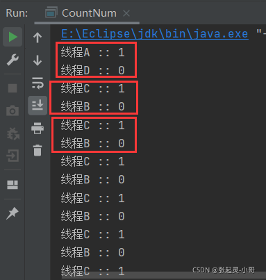 package test.count; /** * 多线程计数案例:synchronized实现方式 */ class Share { private int num = 0; public synchronized void incr() throws InterruptedException { while (num != 0) { this.wait(); } num++; System.out.println(Thread.currentThread().getName() + " :: " + num); this.notifyAll(); } public synchronized void decr() throws InterruptedException { while (num != 1) { this.wait(); } num--; System.out.println(Thread.currentThread().getName() + " :: " + num); this.notifyAll(); } } public class CountNum { public static void main(String[] args) { Share share = new Share(); new Thread(new Runnable() { @Override public void run() { for (int i = 0; i < 10; i++) { try { share.incr(); } catch (InterruptedException e) { e.printStackTrace(); } } } },"线程A").start(); new Thread(new Runnable() { @Override public void run() { for (int i = 0; i < 10; i++) { try { share.decr(); } catch (InterruptedException e) { e.printStackTrace(); } } } },"线程B").start(); new Thread(new Runnable() { @Override public void run() { for (int i = 0; i < 10; i++) { try { share.incr(); } catch (InterruptedException e) { e.printStackTrace(); } } } },"线程C").start(); new Thread(new Runnable() { @Override public void run() { for (int i = 0; i < 10; i++) { try { share.decr(); } catch (InterruptedException e) { e.printStackTrace(); } } } },"线程D").start(); } }