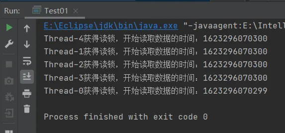 可以看到这五个子线程都可以顺利的获得读锁来读取数据。即读读共享。