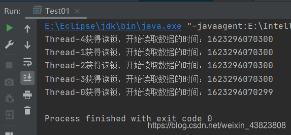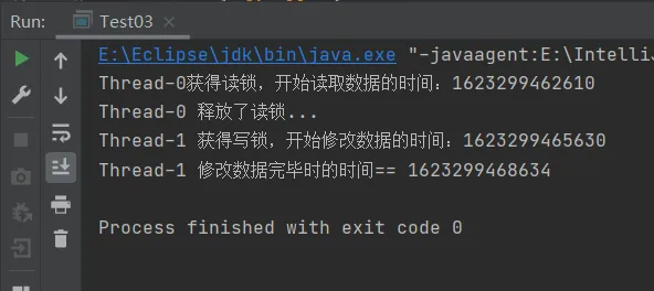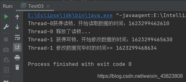 可以看到,当Thread-0获得了读锁之后,在它读取完数据之前,其他线程是无法进来获得写锁的(但是可以获得读锁),也就是保证了当前获得读锁的线程读取到的是最新的数据(未被其他线程修改的数据)。而当Thread-0读取完数据释放了读锁之后,Thread-1这个时候才可以获得写锁进行数据的修改,而当一个线程获得写锁的时候,其他任何线程都无法获得读锁和写锁。