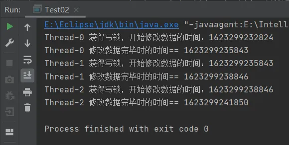 可以看到,当Thread-0获得了写锁之后,在它修改完数据,释放写锁的这段时间内,其他线程是无法进来获得写锁的。其他线程要想获得写锁,必须等待其他线程修改完数据释放了写锁才可以。即写写互斥。