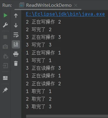 而写操作全部完成之后,下面进行的是从map集合中读数据的过程,可以看到线程3、2、1同时都在进行读操作,也都同时读取完成了,这就说明多个线程之间是可以同时读,也即读读共享(要想获取某个数据的读锁,就要确保该数据的写锁没有被其他线程所持有就可以了)。