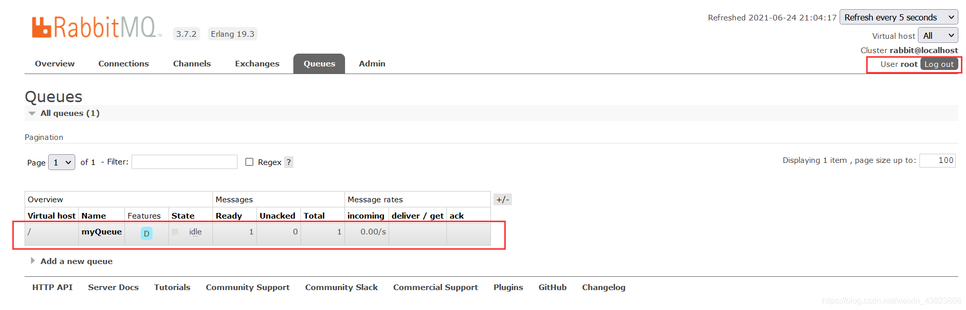 执行完消息发送类之后,等待大概5秒,可以在RabbitMQ的管理界面看到队列中接收到了一条数据。