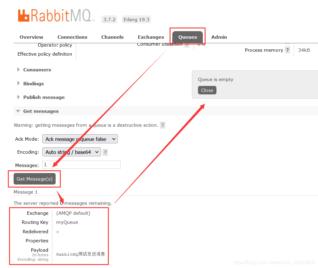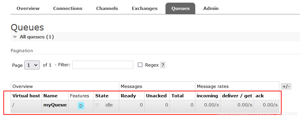 而在RabbitMQ的管理界面中可以看到的是,执行完消息发送类之后,队列中多了一条数据,此时再执行消息接收类,那么队列中的数据就会被取出。