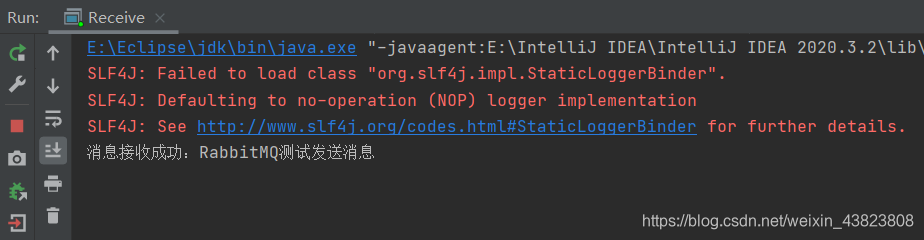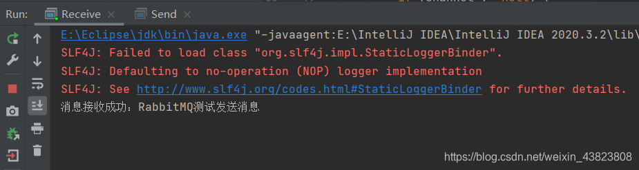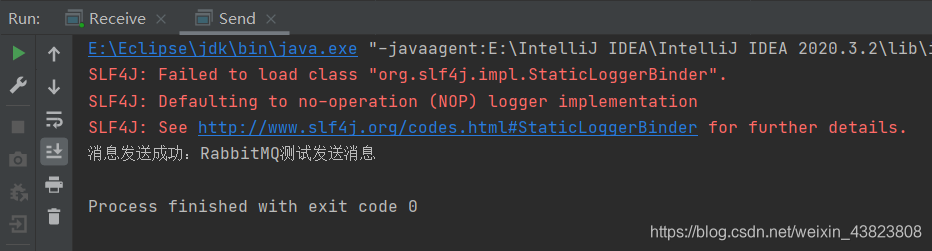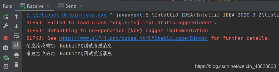 首先执行消息接收类,确保消息的接收者一直处于监听消息队列的状态,然后我们依次执行消息发送类,看看会出现什么结果。