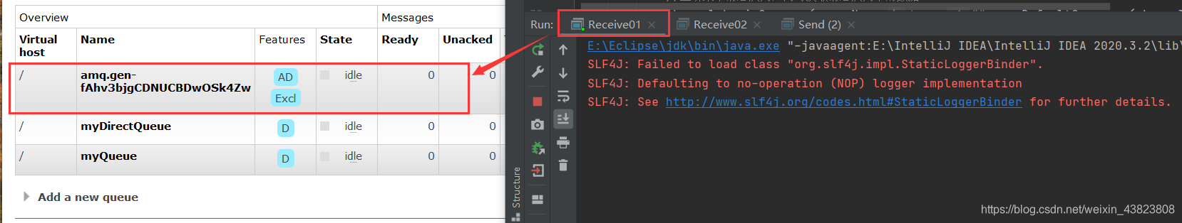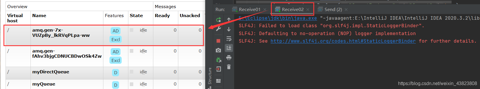 运行之后,在RabbitMQ的管理界面可以看到Queues中,会生成两个随机名称的消息队列。