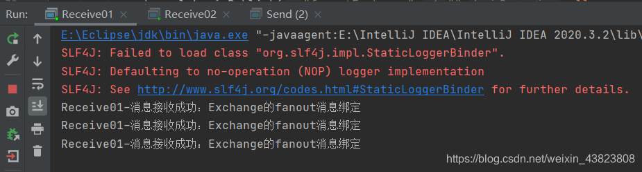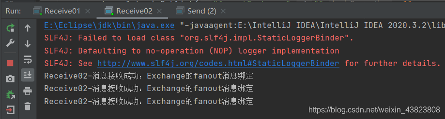 此时直接运行这两个消息接收者,使得它们俩一直处于对消息队列的监听状态,一旦有消息发送,则会立刻接收到消息。