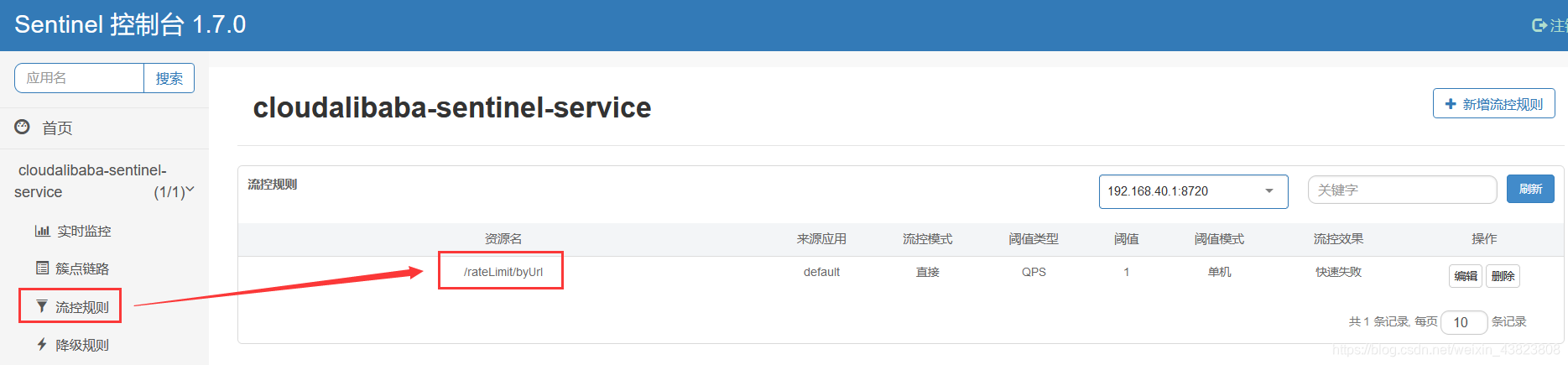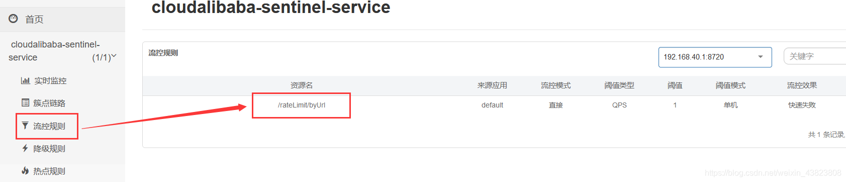 因为我们进行了规则持久化配置,也就是pom依赖 + yml起到了作用,再次重启8401微服务模块,稍等一会(同时多次访问 /rateLimit/byUrl 请求),之后刷新sentinel页面,可以看到刚刚的/rateLimit/byUrl 请求对应的流控规则又出现了,此时就说明持久化验证通过。
