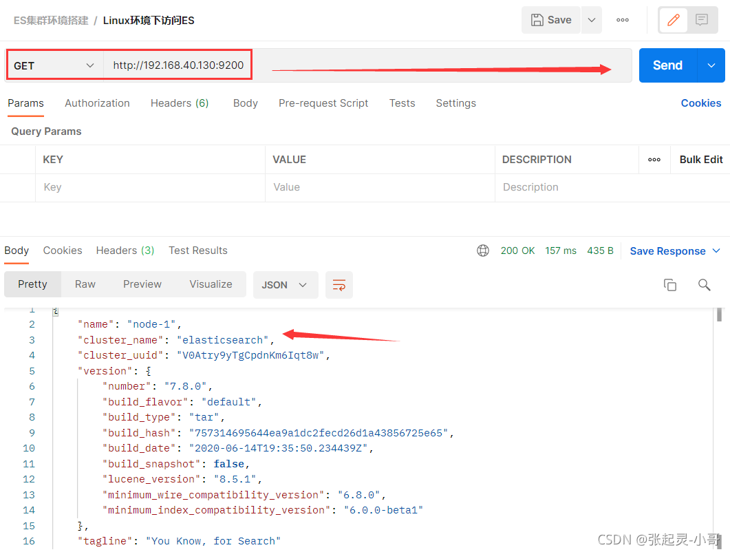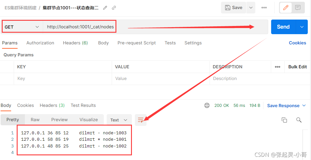 bin/elasticsearch -d启动完成之后,测试:http://虚拟机ip:9200/_cat/nodes,即可看到和上面windows集群在Poatman中相同的测试结果。