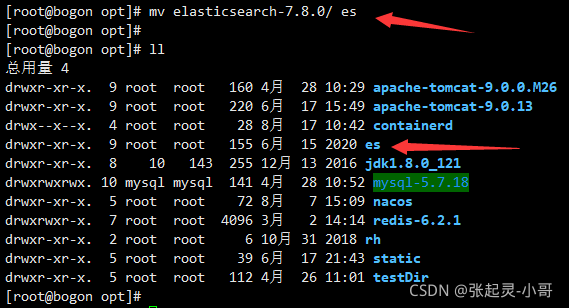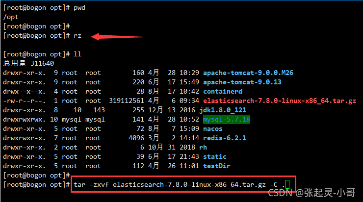 首先直接rz,将es的linux版本压缩包上传至linux中,然后tar -zxvf解压。