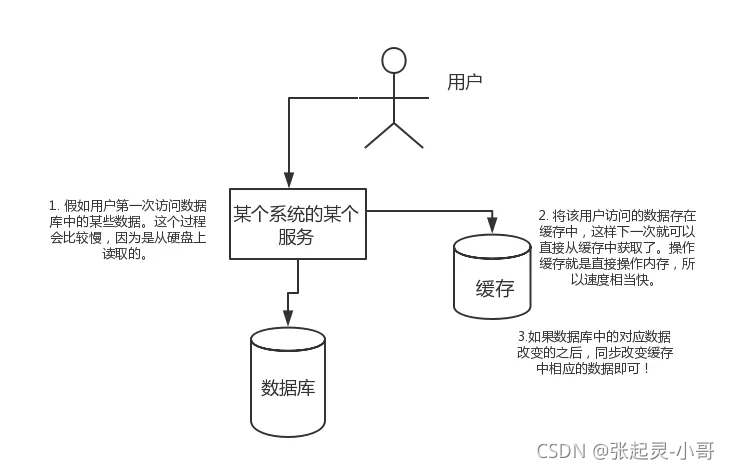 假如用户第一次访问数据库中的某些数据。这个过程会比较慢,因为是从硬盘上读取的。再将该用户访问的数据存在缓存中,这样下一次再访问这些数据的时候就可以直接从缓存中获取了。操作缓存就是直接操作内存,所以速度相当快。如果数据库中的对应数据改变的之后,同步改变缓存中相应的数据即可!
