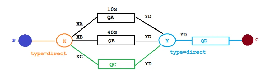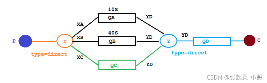 该案例是通过对队列设置TTL来实现延迟队列的,一个队列的TTL是10s、另一个队列的TTL是40s。