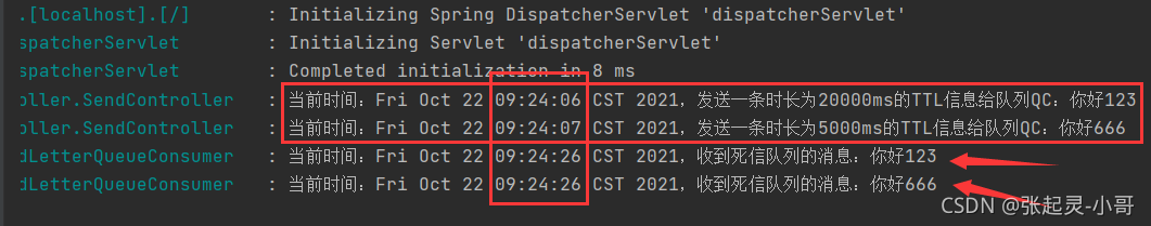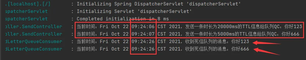 最后我们启动测试。从结果中看到,我们发送了两条消息到MQ中,一条消息的TTL为20s、另一条消息的TTL为5s,按道理说肯定是5s的这个先被消费者从死信队列中取走处理,但是结果好像不太给面子,两条消息竟然都等到了20s才变成死信消息进而被消费者消费。