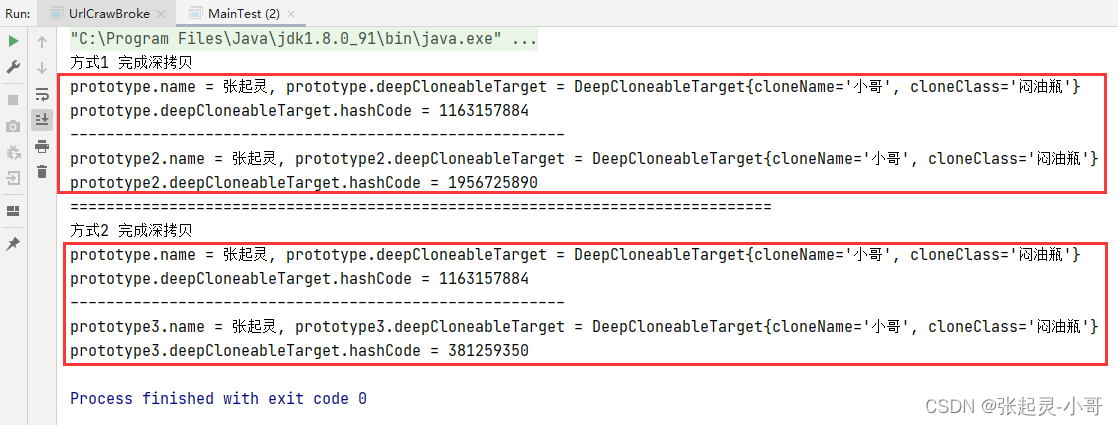package com.szh.prototype.deepclone; public class MainTest { public static void main(String[] args) throws Exception { DeepPrototype prototype = new DeepPrototype(); prototype.name = "张起灵"; prototype.deepCloneableTarget = new DeepCloneableTarget("小哥","闷油瓶"); //方式1 完成深拷贝 DeepPrototype prototype2 = (DeepPrototype) prototype.clone(); System.out.println("方式1 完成深拷贝"); System.out.println("prototype.name = " + prototype.name + ", prototype.deepCloneableTarget = " + prototype.deepCloneableTarget); System.out.println("prototype.deepCloneableTarget.hashCode = " + prototype.deepCloneableTarget.hashCode()); System.out.println("-------------------------------------------------------"); System.out.println("prototype2.name = " + prototype2.name + ", prototype2.deepCloneableTarget = " + prototype2.deepCloneableTarget); System.out.println("prototype2.deepCloneableTarget.hashCode = " + prototype2.deepCloneableTarget.hashCode()); System.out.println("=============================================================================="); //方式2 完成深拷贝 DeepPrototype prototype3 = (DeepPrototype) prototype.deepClone(); System.out.println("方式2 完成深拷贝"); System.out.println("prototype.name = " + prototype.name + ", prototype.deepCloneableTarget = " + prototype.deepCloneableTarget); System.out.println("prototype.deepCloneableTarget.hashCode = " + prototype.deepCloneableTarget.hashCode()); System.out.println("-------------------------------------------------------"); System.out.println("prototype3.name = " + prototype3.name + ", prototype3.deepCloneableTarget = " + prototype3.deepCloneableTarget); System.out.println("prototype3.deepCloneableTarget.hashCode = " + prototype3.deepCloneableTarget.hashCode()); } }