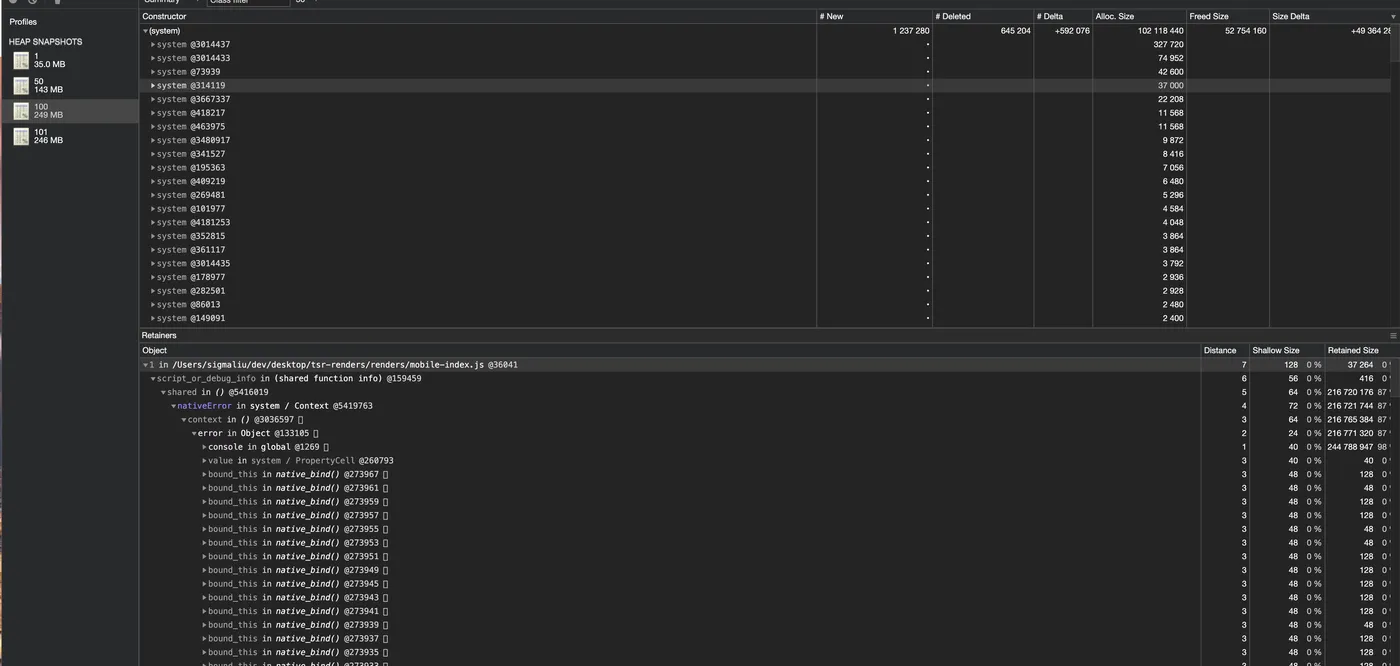 知道是内存泄漏,我们就需要找到泄漏的点。因为不能轻易操作线上环境,线上代码也是压缩的,因此我们需要先搭建本地环境看能否方便调试问题。这里我们我们可以在本地起 Server 后,写脚本发起请求,来模拟线上环境。(但是看过上篇文章的小伙伴都知道,我们还有个骨架屏的模式,可以跳过发起 CGI 请求的步骤,大大降低单次请求耗时,让这个结果几秒钟就出来了)