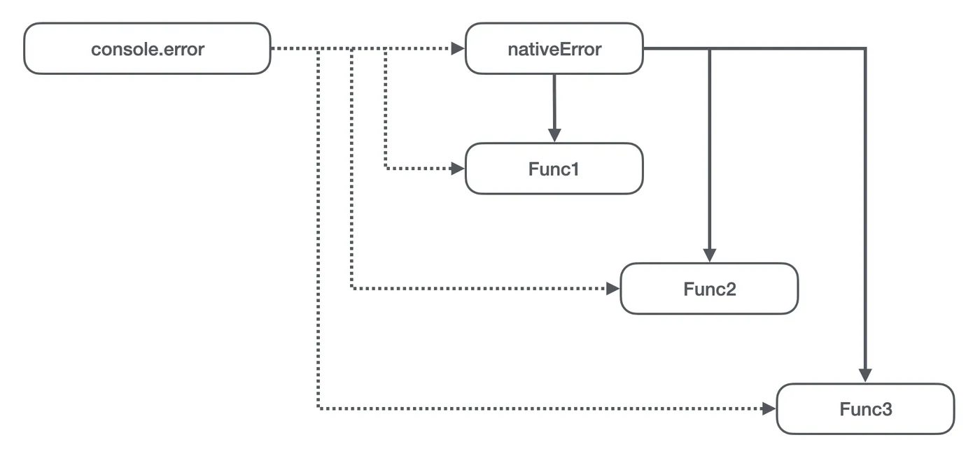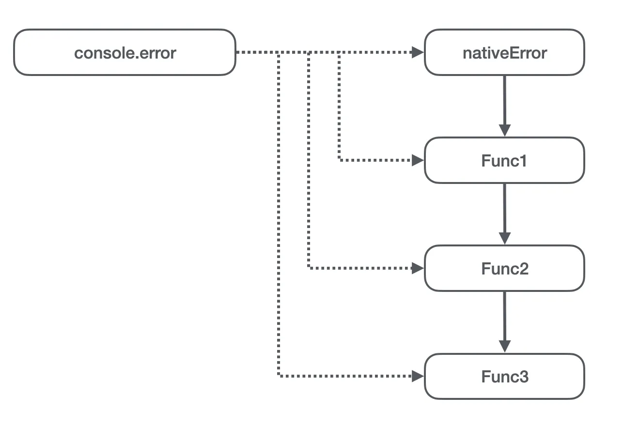console.error方法,但是引用到的已经是第 2 步设置的 Func1,也就是 Func2 引用了 Func1。同时它又将宿主环境上的console.error设置成了 Func2; - 同理,Func3 引用了 Func2,并且
